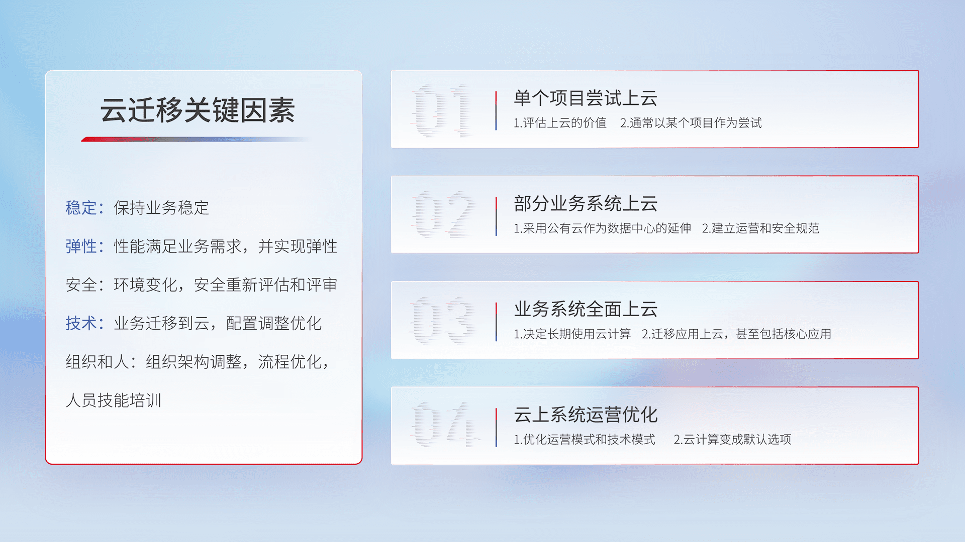 结合实际业务,,,从规划设计、、、、云平台选型、、、云原生改造、、数据迁移、、集成交付,,迁移全过程为客户识别最佳上云路径,,,,做好风险识别管理,,设计网络架构、、、、身份权限、、安全审计合规、、、、操作审计、、日志审计、、、、监控告警策略、、多站点容灾设计等,,,对云上基础设施进行整体规划,,,提升IT治理水平,,,,以满足弹性、、、、高可用、、高性能的需求。。。。